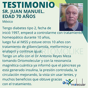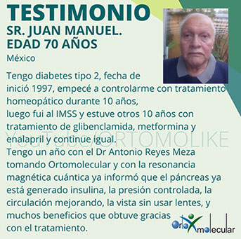 Tengo 1 año con el Dr. Antonio Reyes Meza tomando Ortomolecular y con la resonancia magnética cuántica ya informó que el páncreas ya está generando insulina, la presión controlada, la circulación mejorando, la vista sin usar lentes y muchos beneficios que obtuve gracias al tratamiento.